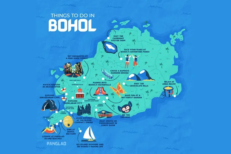 Bohol sits in the Central Visayas. Panglao Island handles the beach stays and boats. The main island holds rivers, caves, and the Chocolate Hills. Expect easy days, family-friendly stops, and good snorkeling.
