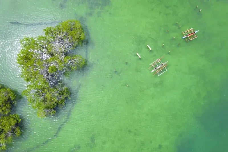 Clear drop-offs, healthy coral, and frequent turtle sightings. Snorkeling is from small boats over bright patches.